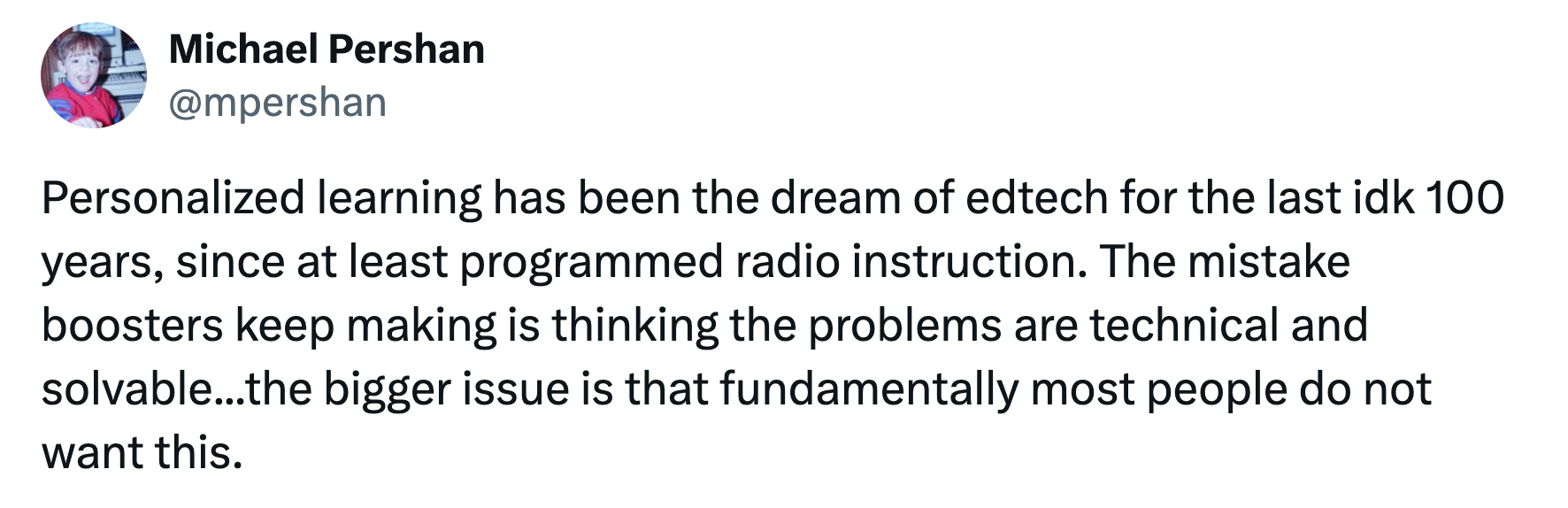 You can try to convince people to want something they do not want. You can yell into the wind. You can swim against the river. But the most prominent boosters of personalized learning do not seem to engage meaningfully with the nature of the wind or the river, with the reality that most people are not like them, that most people do not want this.