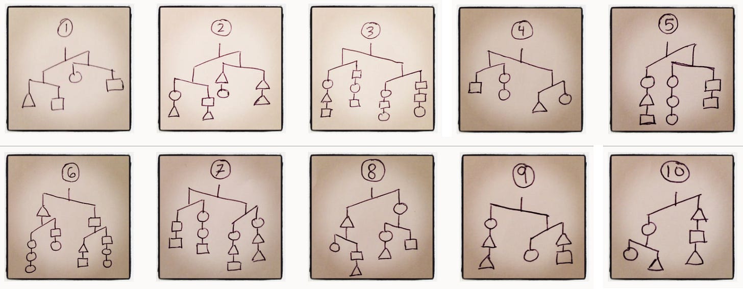 ¶ Which shape weighs the most in each sketch? No numbers. No operations. Lots of math. Thanks to Michael Pershan for reminding me of this problem set from blog-era all-timer Paul Salomon.