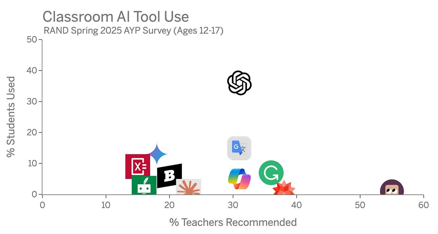 ¶ Related: I loved reading RAND’s survey of students and their use of AI and I don’t think I saw anyone report on it. One interesting question asked students “so what tools are your teachers recommending?” and then “what are you actually using?” I went ahead and plotted both sets of data simultaneously and you can get a preview of the popularity of these study modes. The max teacher recommendation was for Khanmigo—a Socratic tool. Kids went ahead and used vanilla ChatGPT anyway.